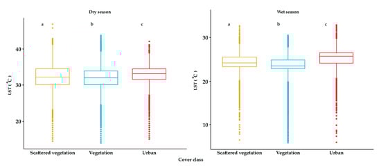 Figure 3A shows the historical spatial distribution of LST in Mérida, calculated from the Landsat images from 1995 to 2019 by dry and wet seasons. In general, an increase in the LST was observed from 1995 to 2019 in both seasons; however, the increase is more evident in the wet season with an increase of approximately 2 to 3 °C. Particularly, in the dry season, the highest temperatures were observed in 2014 and 2019 with an average of LST of 32.90 °C (18.3–47.5 °C) and 35.45 (23.1–47.8 °C), respectively. In the wet season, the year 2000 showed the highest average of LST with 28.25 °C (16–40.5 °C) (Table 5). The LST values showed significant differences between the coverage classes for dry and wet seasons (F = 8532, p = 0.0001; F = 50,636, p = 0.0001, respectively). In the dry season, a greater variation in the LST was observed in the scattered vegetation and vegetation cover classes, contrary to what was observed in the wet season. All classes showed an increase between approximately 8 and 10 °C between dry and wet season (Figure 4).