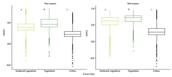 Figure 3B shows historical spatial distribution of NDVI values in Mérida. In general, a decreasing pattern in NDVI values is observed in the last 24 years, suggesting a decrease in vegetation vigor, as well as a consequence of the change in land use. In particular, it was observed that the lowest NDVI values are located in the area corresponding to the center of the city, as opposed to the periphery of the study area, where the highest values are located. The variation of the NDVI values in the whole study area is between –0.3 and 0.93 in the dry season and between –0.2 and 0.93 in the wet season. Table 5 shows the median, as well as the maximum and minimum values of the NDVI, and LST per season per year. In terms of coverage classes, significant differences were observed between them (Figure 5). Statistically significant differences were observed in the NDVI values with respect to the coverage classes in the dry season (F = 268,025, p = 0.0001), as well as in the wet season (F = 395,166, p = 0.0001) (Figure 5).