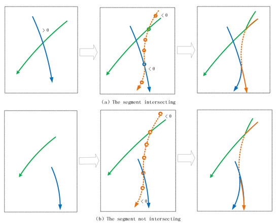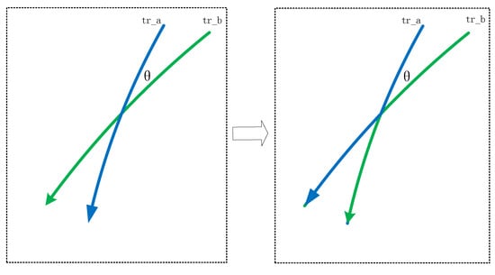 Figure 1. The process of exchanging intersecting trajectories. - Step 3: Introduce fewest dummy segments to pair the remaining trajectory segments within orientation divergence degree . For all the left alone (unpaired) segments, we apply k-means clustering to find the smallest k centroids that place all the segments into clusters of radius , and result pairs. The main purpose of this step is to make a pair of the remaining trajectory segments. The principle of this step is to introduce virtual segments, which are combined with residual trajectory segments to form a pair of trajectories with directional divergence (intersecting angle) within . As shown in Figure 2, in order to construct the virtual segment, the intersection point of the virtual segment and the trajectory segment should be determined first, and then the input and output point of the virtual segment should be constructed with the intersection as the center. In order to reduce the number of virtual segments as much as possible, adjacent virtual segments can be merged into one segment by smooth connection.