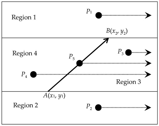 This paper extends the puncture method to multilayer complex road network design. Assume that ray extends to point , and is the initial point to make a ray from left to right. For each edge of the polygon, the puncture method is used to determine whether P is on or if P and are intersected. We then distinguish this into four regions for the puncture method, as shown in Figure 2. The lines of P1, P2, and P3 and do not intersect, while P4 and are intersected. P5 is on the ray and P5 is within the polygon. To provide all edges of the vertices on the polygon, the difference-product’s y-coordinate is given by
