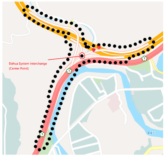 We considered that traffic facilities consisted of interchange and service stations. Roads included national highways, express highways, provincial highways, county highways, district roads, and normal roads. Our large fleet management system included the segment data arranged as in Table 1. Traffic facilities and roads as eight-segment layers on Taiwan main island were collected from GPS instruments installed on large trucks. Table 2 shows that the quantity (QTY) of GPS data has one million empirical data points. Transmission was the fourth generation of mobile phone mobile communication technology standards (4G). The source data were collected from 35 trucks with eight working hours per day for one month, and the sampling interval was 30 s. Plane coordinates were used in the large fleet management system, thus type of orography was not considered in this study. Table 3 gives an example of an interchange, which includes one center point and 99 vertices from our system. A polygon was composed of 99 vertices. Figure 3 illustrates the example from Table 3 on a map using ArcGIS software. When a point falls within this polygon, the point information can be displayed in the caption field.