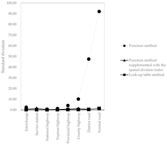 In Table 6, the experiments still featured 100,000 samples with 50 runs. To compare individual calculations with the groupings, Table 6 performed better than Table 5. The grouping of roads took more time than the grouping of traffic facilities. In this case, the puncture method reduced the efficiency of process execution and affected the output performance. The look-up table method still required much less computation time than the other two methods. The look-up table method also produced a stable performance. The three categories of standard deviations are summarized in Table 7. For traffic facilities and roads, the puncture method had larger standard deviations. Grouping traffic facilities and roads provided better results than using individual layer calculations. All eight-segment layers were grouped together (i.e., traffic facilities and roads). The puncture method provided a very large standard deviation value of 49.8420, whereas the other two methods had low standard deviations. Therefore, different grouping combinations can affect the efficiency of multilayer-based map matching in different ways. The category of roads is also more complicated than traffic facilities, so applying the puncture method with vector data may yield excess computing loads and delays. However, the grouping using the puncture method supplemented with the spatial division index and look-up table method can retain small standard errors of measurements.