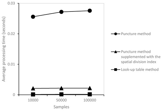 Based on Equation (15), comparing other puncture methods with the puncture method supplemented with the spatial division index, the improvement was 92.11%; thus, the efficiency was significantly improved. This indicates that the spatial division index can enhance the efficiency of map matching. The highest improvement was 99.45% between the puncture method and the look-up table method. In terms of average processing time, the puncture method with the spatial division index was the second-best approach. Thus, map matching based on a raster data structure using the look-up table method was more efficient than the other two methods. Figure 5 shows three samples of 10,000, 50,000, and 100,000, and illustrates that the line of the puncture method was higher than the other two lines when the sample increased. This study employed a statistical test method using the independent samples test [42] and arranged the values in SPSS software. Table 9 shows that the P-value for Levene’s test was 0.000, which is statistically significant at a P < 0.05 level. Thus, the variances were not equal. The P-value of the independent T-test was 0.000, which is statistically significant at a P < 0.05 level. Therefore, the puncture method supplemented with the spatial division index and the look-up table method offer significant improvements.