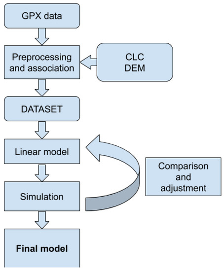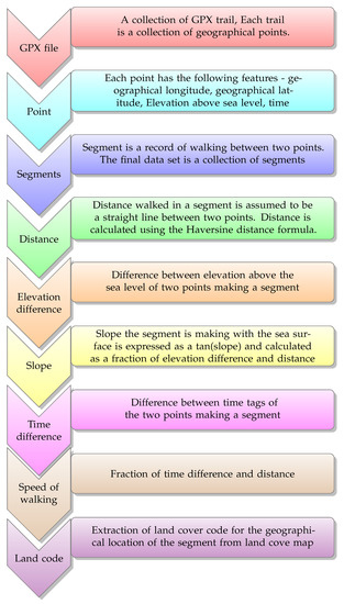 The complete diagram of pre-processing data is depicted in Figure 1. GPX set contains a set of GPX files. Each file consists of a trail of one person walking. A GPX trail is a record of a series of geographical points where a person wearing a GPS device was walking. Trails were processed and transformed into segments. A segment describes walking between two points on the earth’s surface. Each segment is described with start and end points as well as start and end time. From this information, we can easily calculate the necessary features of a segment: distance length, the slope of the terrain and the speed of walking segment.