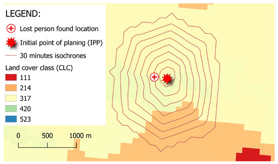Result of simulation with isochrones showing maximal reached area in every half an hour. IPP is taken from archive of SAR activities, and location where subject is found is denoted with red cross.