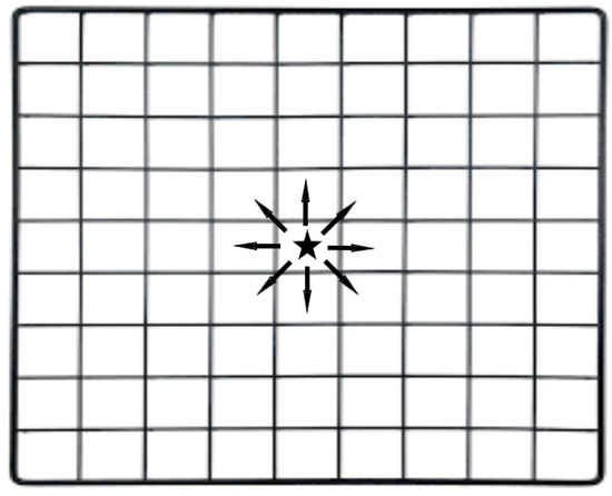 As already mentioned, predicting the search area is performed by running a simulation of walking the terrain surrounding the initial point of search. Before running the simulation we prepare a cell grid of the terrain features surrounding the initial point. Each cell covers 5 m × 5 m area, since this is the most precise resolution of the data we use. We create a grid with 400 cells in each direction (up, down, left and right) of the initial point. The reason for choosing exactly 400 cells is to cover the maximum radius of 2 km distance. Each cell is described with elevation above the ground (dem) and Land Cover id (LC id) read from GIS data. The simulation is performed in time ticks. Initially, a person is located in the initial point—IPP located in the center of the grid. The cell in the center is assigned a visited state and is labeled active for calculation. For all 8 surrounding cells as shown in Figure 5 we calculate the time taken to reach the cell. The time needed to reach the cell is time for walking 5m for up, down, left and right cells, and 7.25 m for diagonal cells. When assigning the distance, we do not calculate the distance that takes into account the difference in elevation, since the elevation difference is taken into account in the other features—slope and elevation difference. The time of walking the segment is predicted using the model in the form of Equation (1).