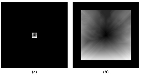 Surrounding cells become visited and are labeled active for activation in the next step. Active cells are assigned a value of the time taken to reach them from the IPP. The simulation is done in iterations, calculating the time taken to reach each surrounded cell of all active cells. If a cell can be reached from more than one active cell, the cell is assigned the value of the lowest time to reach the IPP. The simulation runs until all cells are visited. The dynamic of this process is depicted in Figure 6 where figure (a) depicts the state of the cells after 30 ticks and (b) after 300 ticks.