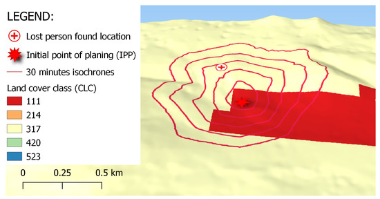 To evaluate the results, we ran the simulation for 20 locations from the archive data of the lost person SAR and compared the location where the person is found and the isochrones resulting from the simulation. Out of 20 cases, four people were found outside the area predicted with our method. For nine simulations the lost person is found within the first isochrone, in six cases within 2. isochrone, and for 1 case the person is found within 3. isochrone line. This is summed up in Table 4.