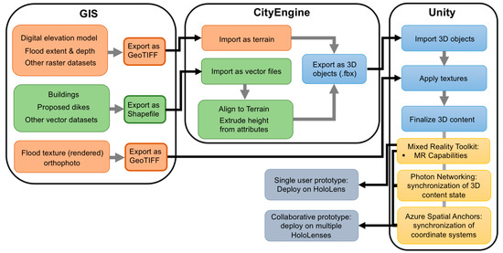 This section describes the development methodology for the mixed reality flood visualization tools. The workflow consists of data preparation in a geographic information system (GIS) environment, conversion of data into 3D objects in CityEngine, integration of mixed reality capabilities, and development of the user interface in Unity, based on the mixed reality toolkit [32]. This development workflow mirrors other attempts at 3D geovisualization using HoloLens, with some changes in the software used [21,33]. A high level summary of the process is presented in Figure 1 below, with details expanded in the following sections. The development process was guided by our experience interacting with local planners and observing their policy meetings. We aimed to create visualizations that would reflect (i.e., be useful) current data and flood risk management practices and policies developed by the City of Vancouver. The visualizations are evaluated based on their hardware performance, usability (using Vi et al. [34] usability heuristics) in the Results section.