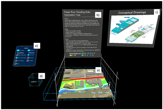 To develop the visualizations, various layers were used, including the digital elevation model (DEM) at 0.5 m resolution (later converted to 1 m resolution for improved performance of the visualization system), orthophoto, flood depths, building footprints, and river setbacks. DEM, orthophoto, and building footprints are available on the City of Vancouver Open Data Portal, while flood depths, and river setbacks were provided to us by municipal planners. Other layers (e.g., protection infrastructure) were digitized based on existing adaptation proposals developed by the City [36]. All layers were projected to UTM10N in QGIS and clipped to the appropriate extent. To develop 3D representation of flood depths, the flood depth layer was overlaid with DEM to derive DEM-adjusted flood depth, where the height of water was calculated as flood depth + current elevation (i.e., flood elevation is now relative to absolute elevation, not referencing the DEM elevation). Once the layers were prepared and clipped to an appropriate extent (discussed below), raster layers were exported in GeoTIFF format, and vector layers as shapefiles. These layers were then imported into CityEngine software, with DEM and DEM-adjusted flood depths as terrain layers, and buildings, dikes, and setbacks as vector layers. DEM was textured with orthophoto at 0.2 m resolution, and flood depth was textured identically to existing flood maps published by the City. To derive 3D geometry from vector layers, base heights were adjusted to the DEM and building layers’ attribute height information was used to extrude buildings. The proposed dikes do not contain specific information on their dimensions, so they were represented as 4-m wide and 6-m high splines, colored in red. The setback lines were visualized as 2 m wide 10 m high splines, colored in white. The 3D geometry generated in CityEngine was exported in Filmbox (.fbx) format, which can be imported across 3D modeling/game engine software, including Unity, which was used to integrate mixed reality capabilities [37].