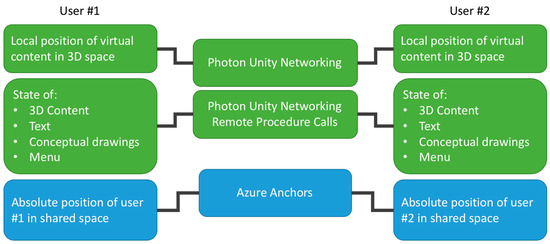 To develop the collaborative tools for mixed reality applications we needed to resolve three aspects: synchronization of content, position of content in the local coordinate system, and positioning of the coordinate systems across devices. To synchronize the local position of content in the scene, we used basic Photon Unity Networking setup (described in MRTK documentation) [41]. To enable synchronization of content state/interaction, we used remote procedure calls, which enabled us to synchronize state of scripts/objects across two users. To co-locate virtual objects in a shared environment, we used the Azure Anchor infrastructure [40]. All of the content of the visualization is attached to a virtual cube, which is used as an anchor. When a user moves the cube and creates an anchor using a button, and then shares it to the network, another user can retrieve this anchor and co-locate it in space based on the similarities of spatial maps of the environment scanned by two HoloLens devices. Both Photon Unity Networking and Azure Anchors rely on local wi-fi network to update state of the content across two devices. This infrastructure is visualized in Figure 4 below.