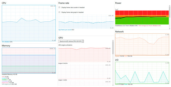 Screenshot of a live hardware usage of shared MR (mixed reality) visualization. As you can see, the usage of CPU (central processing unit) is at 50–60%, and GPU load fluctuates at almost 100%, with framerates fluctuating between 50–60 fps, which is sufficient for smooth application performance.
