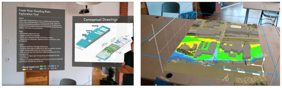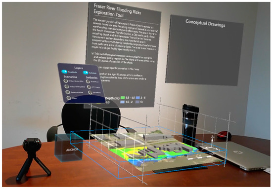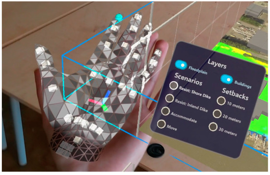 Concurrently, researchers are investigating ways to leverage emerging 3D interfaces to improve interaction with, and perceptual experiences of, 3D data. Within the FRM domain in particular, mobile augmented reality tools have been developed to visualize flood impacts in situ (e.g., [9,10,11,12]), ex situ (e.g., [13]), and immersive virtual environments have been created to visualize potential futures for coastal adaptation [11,14,15]. This growth in research interest has mirrored the development of a new generation of mixed reality (MR) interfaces that have potential to alter, and potentially improve, our interaction and understanding of complex 3D data. When discussing mixed reality tools, we largely follow the definition of an augmented reality (AR) system offered by Azuma [16], where the system combines virtual and real content, is registered in three-dimensional space, and is interactive in real time. The visualization solution described in this paper is distinct from other types of tangible interfaces, such as AR sandboxes, where physical objects are augmented with digital overlays of data (e.g., [17,18]). We use the term MR instead of AR for two reasons: AR systems often focus on augmenting the real landscapes with virtual content, while our application is more environmentally agnostic (thus, further along the virtuality continuum of Milgram and Kishino [19]. Secondly, the term MR has been used widely by researchers and developers to describe head-mounted display-based systems for AR/MR (e.g., [20,21]).