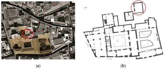 (a) Modern aerial photograph of the Pinelo Palace and its surroundings (overview through Google Earth). (b) Ground floor and mezzanine (indicated by the red circle). Authors’ own drawing, 2020.