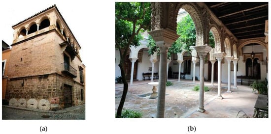 The lookout tower built in the corner between the two exterior façades of the building would be the first such tower built in Seville under the influence of the villas of the Italian Renaissance. Under the lookout tower is the entrance (Figure 2a). The main courtyard constitutes a prime example of Sevillian Renaissance architecture and contains three galleries on the ground floor and four on the first floor. The arches on the ground floor include original decoration with plasterwork and are supported by columns of imported Genoese marble (Figure 2b). These arches form part of an interesting evolutionary sequence of the courtyards in the main palaces of Seville, and combine influences from Mudejar and Gothic art [], ranging from the Palacio del Rey Don Pedro in the Real Alcázar, through the Casa de Pilatos, and the Palacio de las Dueñas []. The first-floor gallery of the courtyard was recovered and decorated in the second half of the 20th century, after being partitioned to create rooms when the building was Guest House Don Marcos [].