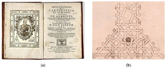 These ideas are now well-known and accepted thanks to the studies of Nuere-Matauco [,,], and based on the book by Diego López de Arenas that included different rules on interlocking patterns that the carpenters used in Hispano-Muslim and Mudejar art. After a first manuscript in around 1619, it was published in 1633 with the title Breve compendio de la carpintería de lo blanco y Tratado de Alarifes [] (Figure 4a). Interlocking patterns were also dealt with in another contemporary document by Fray Andrés de San Miguel that remained unpublished until the 20th century []: folios 72 to 92 include a section on carpentry based on documents that are now missing but have nothing to do with the book by López de Arenas.