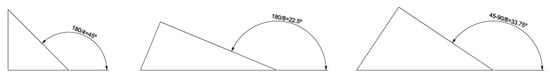 The “cuartillejos” are square modules in which the eight-point stars can be traced by various methods using bevels with different angles, called “cuadrado”, “ocho” and “ataperfiles”. The first two are created by dividing 180° by the number that defines them (180°/4 and 180°/8). The third is computed from the formula 45° − 90/n, where n is the number of points of the star in the interlocking pattern, in this case n = 8 (Figure 5). The complete geometric construction of the eight-point and 12-point stars (Figure 6) is well-known and explained in the aforementioned publications. Finally, the size and number of ceiling modules are fitted to the dimensions of the room to be covered.