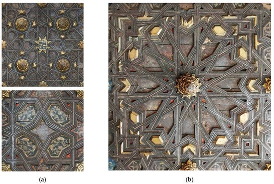 Ceiling details: (a) Eight-point star and “cuartillejos”. (b) “Cuartillejo” with a 12-point star. Authors’ own photographs, 2020.