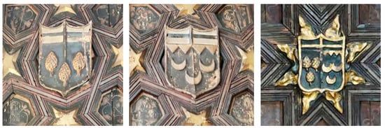 The ceiling also includes heraldic coats of arms and other decorative elements, “florones” or “piñas”, which refer to the names of the Pinelo and De la Torre families who commissioned the construction of the building (Figure 7).