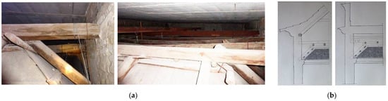 Hidden structural elements. (a) Anchorages of the 16th-century wooden beams on the wall/new metal girders and roof tie rods. Photographs by Ramón Queiro Quijada, 2016. (b) Schematic sections (hand drawn): hypothesis inclined roof of disappeared wood (left)/current state with new concrete slab and metal beams (right).