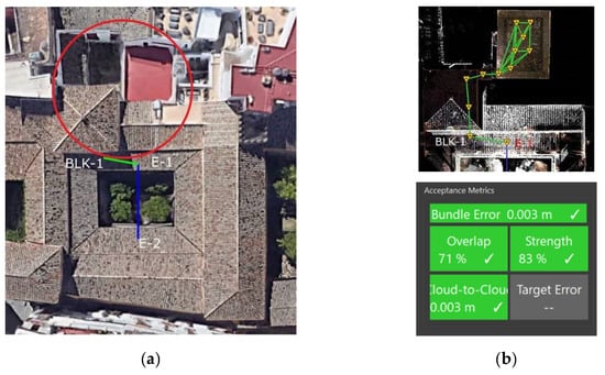 The C10 capture parameters both in E-1 and E-2 included the following: capture of points at medium spatial resolution at which each point is separated from its neighbours by 1 cm assuming a plane located 10 m away; the image resolution captured by the scanner was 1920 × 1920 pixels. The remaining scans were carried out with the following BLK360 parameters: medium spatial resolution (1 cm at 10 m) while the images were taken in HDR at those scan stations where the lighting conditions were scarce or where there was a lot of light contrast.