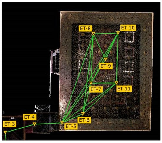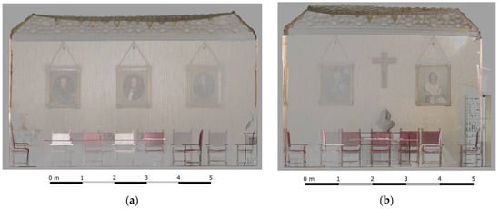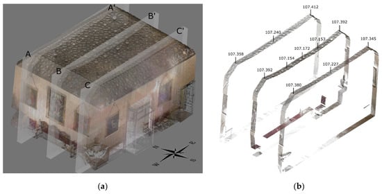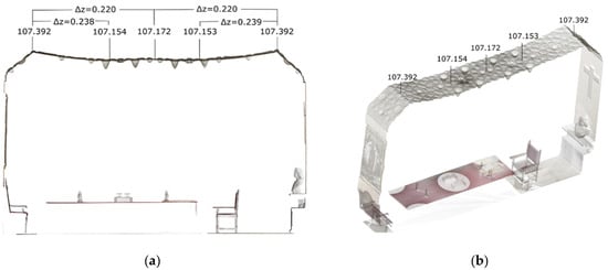 The first method aimed to quantify the deformations, with an approach similar to that in previous work [,]. Vertical deformations are better observed if the walls, window, and floor of the room are also included in the survey. The scans carried out allow us to ascertain the whole room with homogeneous precision.