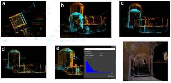 The registration of the scans was carried out visually using Cyclone 360 software in order to maintain greater control over the results (Figure 9b). For each contiguous pair of scans, their plan projections were visually aligned (Figure 11a), and then displayed in elevation and, if necessary, levelled (Figure 11b; in this image the slope of the lower scan has been intentionally exaggerated). After levelling (Figure 11c), the lower scan was moved vertically until the two scans were roughly aligned (Figure 11d), to finally activate the optimisation algorithm which completed the alignment with more accuracy and reported the fitting error, which in our case was 1.6 mm (Figure 11e). The two scan registered with its true colour are shown in Figure 11f where the yellow triangles represent their scan positions.