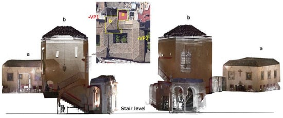 3D orthographic views extracted from the point cloud to better understand the different levels for the mezzanine (a) and the tower above the staircase (b). Central image shows the polygonal sections (yellow) and the viewpoints VP1 and VP2; the left image was observed from VP1 and the right image was observed from VP2.