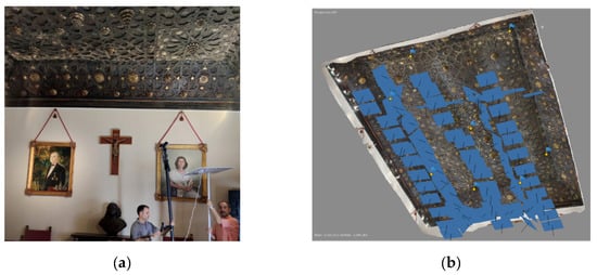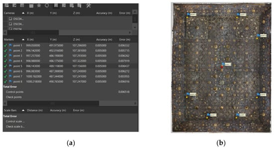 The focal length of the camera was set to 28 mm and the resolution to 24.3 Mp for each image. The photograph alignment was computed using Metashape software with the Accuracy parameter set to medium. The dense point cloud was obtained with medium quality that computed 30,957,566 points, and the model mesh was processed setting the Faces count parameter to high, thereby obtaining a total of 6,191,513 faces. Finally, the texture was computed by setting the following parameters: Mapping mode (Generic), blending mode (Mosaic) and Texture size/count (8000 × 1). The alignment adjustment was carried out by means of control points whose coordinates were obtained from the scans recorded in the previous phase; those coordinates were extracted using the 360º visual capabilities of Jetstream software for each scan station. The total (bundle) mean error was 6.5 mm (Figure 14). This figure also offers an orthogonal image of the ceiling with the location of the control points that were employed in the adjustment.
