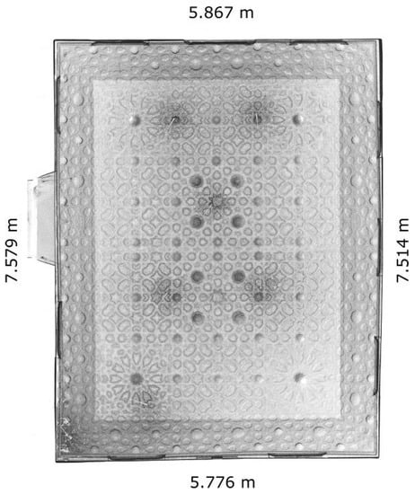 After having analysed several geometric modules of the ceiling, it was found that it is made up of interlocking patterns of eight-point and 12-point stars, and not, as a text from 1542 erroneously describes it, of nine- and 12-point stars. In the final orthoimage (Figure 20), it can easily be observed that the ceiling is composed of “cuartillejos” or modules with a square base, but its modulation is altered in the central part, where a small strip is duplicated, to fit the design to the room dimensions. From this it follows that there was no unitary project for the whole building: the ceiling design had to be fitted to a room whose walls were probably deformed.