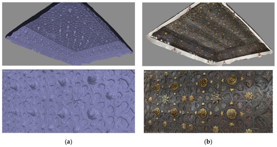 General view and details of the mezzanine ceiling from photogrammetry: (a) 3D surface model. (b) 3D textured model.