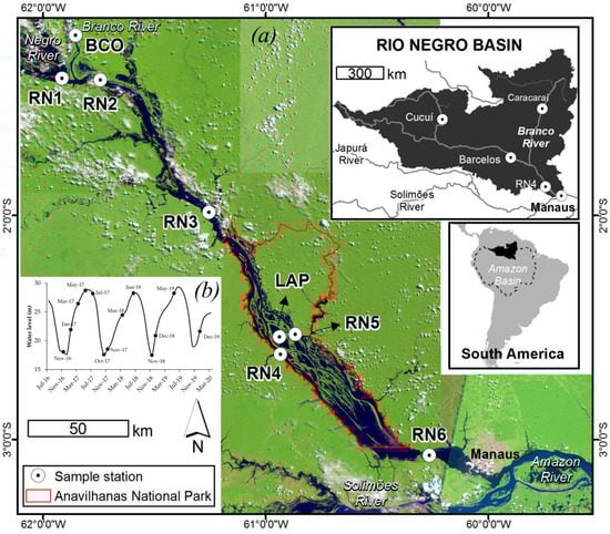 The study was conducted along of the lower course of the Negro River, north of the Amazon basin, and between the confluence of the Negro and the Branco rivers and the Anavilhanas National Park (Figure 1a). With 712,000 km2 of drainage area and an annual average water flow of 28,000 m3 s−1, the Negro River is a large and complex multichannel river with archipelagos. The Anavilhanas Archipelago is the most notable geomorphological feature in the low course of this river, due to its complex anabranching pattern, with hundreds of islands and floodplain lakes [].