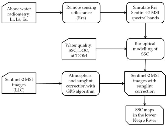 Figure 2 presents a flowchart of the methodology that was used in this study. Data acquisition occurred between 2016 and 2019 at eight sample stations that were visited in different water level periods (Figure 1b). Note that the following nomenclature was used to differentiate rivers and lakes: BCO, RN, and LAP stand for Branco River, Negro River, and Lake Apacú, respectively. Three stations are located near the confluence region of the Negro (stations RN1 and RN2) and the Branco Rivers (station BCO). The stations RN1 and RN2 are located upstream and downstream the mouth of the Branco River, respectively. Five stations are situated upstream (RN3), inside (RN4, RN5, and LAP), and downstream (RN6) of the Anavilhanas Archipelago. Inside the Anavilhanas Archipelago, the station LAP is located on Lake Apacú, and stations RN4 and RN5 are situated on channels at the right and left banks of Negro River, respectively. Each sample station corresponds to a fixed coordinate.
