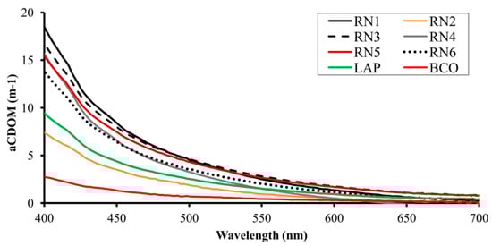 Figure 3 shows the variation of light absorption coefficients (aCDOM) for eight samples stations at the Negro and Branco Rivers and a floodplain lake at the Anavilhanas Archipelago. The aCDOM at 440 nm was higher (> 7 m−1) in the stations that are dominated by black water rivers (rich in dissolved organic matter) and lower (< 2 m−1) at the station BCO (a clear water river).