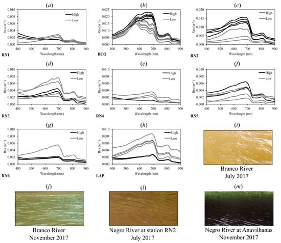 In situ Rrs of the high (black line) and low water period (grey line) of the Negro (a,c–g) and Branco (b) Rivers and of floodplain lake at Anavilhanas Archipelago (h). Water colours variability in the study area (i–m). Note: y-axis of stations BCO and RN2 is different from that of samples stations in the Negro River.