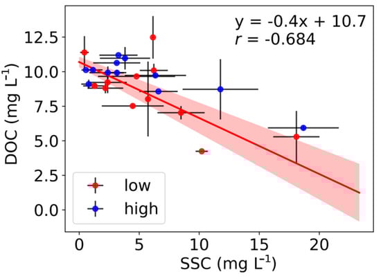 We observed that SSC was significantly correlated with DOC (r = −0.68, p < 0.05) (Figure 5). The magnitude of the correlation coefficient was high during the high water level period (r = −0.83, p < 0.05). The SSC was not significantly correlated with DOC (r = −0.52, p > 0.05) in the low water period.