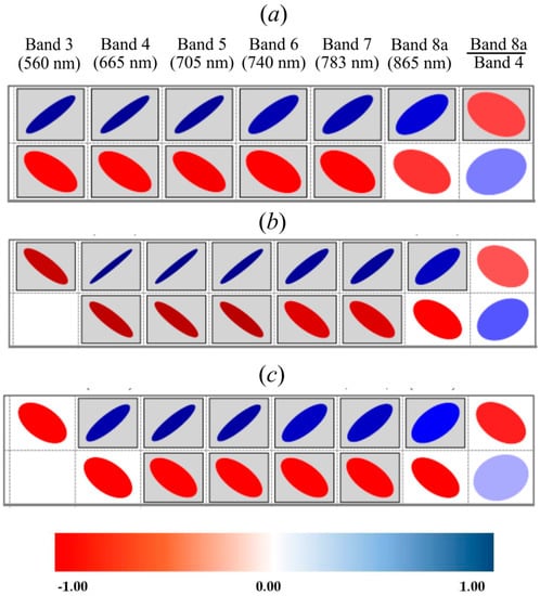 Correlogram maps of SSC (upper rows), DOC (lower rows) and Sentinel-2 MSI simulated bands with in situ Rrs (columns): (a) All dataset. (b) For the high water period. (c) For the low water period. Significant Pearson correlation coefficients (p < 0.05) are showed in grey boxes. Blue colours correspond to positive correlations and red colours correspond to negative correlations. The ellipses forms reflect the high and low magnitude of the Pearson correlation coefficient.