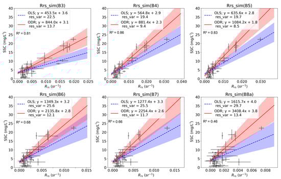 In this study, we developed empirical models that were based on regression analysis between the SSC and the Rrs. The principal characteristic of inorganic suspended sediment is its large impact on the scattering coefficient and, in turn, the increase of the water-leaving radiance due to their greater refractive index [,]. Thus, the regression approach was chosen because the considered SSC values range from low to moderate. For such a range, Rrs increases nearly linearly before reaching asymptotic regime (or “saturation” reflectance) for greater values of SSC, typically >70 mg L−1 []. The Orthogonal Distance Regression (ODR) approach [] was used in addition to the commonly used Ordinary Least Square (OLS) method to better account for the inherent uncertainties of each dataset (Rrs, SSC). The primary advantage of ODR over OLS is its ability to fully take the uncertainty attached to both Rrs and SSC into account [,].