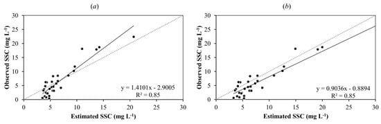 Figure 8 presents the SSC observed versus the SSC derived from Sentinel-2 MSI simulated band 4. It was observed that the SSC derived from simulated band 4 indicated a goodness of fit (R2 = 0.86 for OLS and ODR methods) and, for SSC values lower than 6 mg L−1, the OLS method overestimated the observed values. Figure 8 showed that the main advantage of the ODR method was presenting a lower tendency (less-biased slope values) as compared with those that were obtained using the OLS method (decrease 36%, from 1.41 to 0.90). Therefore, it is emphasized that the ODR method (which considers the associated uncertainties) is more suitable than the OLS method for estimating SSC.