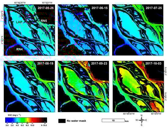 In the central area of Anavilhanas (see stations RN4 and RN5 in Figure 1), the water discharge flows through two large channels near to the right and left banks of the archipelago. However, more SSC in the channel on the left bank of the Negro River was observed from in situ (sample station RN5 in Table 2) and Sentinel-2 data (Figure 11a). For example, in the high water period, the difference in suspended sediment discharge between the stations RN4 and RN5 can be over ten times []. Inside Anavilhanas Archipelago, the highest amplitude of SSC was observed in the Lake Apacú (station LAP in Table 2), with the minimum and maximum values being obtained during the high and low water periods, respectively. During the low water period, part of the water that was stored in the Anavilhanas lakes throughout the high water period flows to the Negro River channels, and this dynamic may influence the process that increases the concentration of the SSC in some channels and lakes of Anavilhanas Archipelago, as observed in Figure 10 and Figure 11.