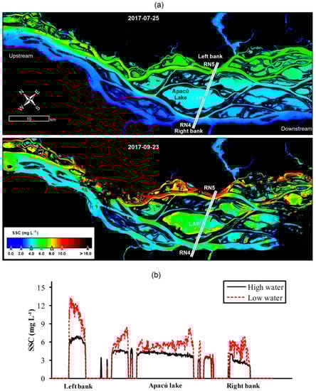 Spatial distribution of satellite-retrieved mean SSC on 7/25/2017 (high water) and 9/23/2017 (low water) in the Anavilhanas central reach (a). Cross profile of SSC between left and right banks (b).