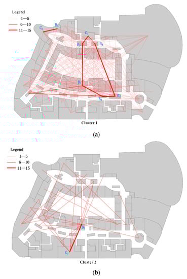 The spatial patterns of the three trajectory clusters are presented in Figure 14. For an indoor semantic trajectory, we split the trajectory into consecutive semantic origin–destination (OD) flows. As an example, an indoor semantic trajectory is split into two OD flows, and . The centroid of an indoor entity is used to represent the corresponding semantic label of the indoor entity. For all OD flows of one trajectory cluster, we count the number of distinct semantic label pairs and show them with graduated symbols. The three clusters have obvious differences in their spatial patterns. For cluster 1, the OD flows of , , , , and are strong compared with the other flows. All these OD flows except are located in the central right part of the shopping mall. Owing to the small trajectory number of cluster 2, is the only strong OD flow. For cluster 3, , , and are strong OD flows, and is the OD flow that cluster 1 does not have. The next largest flows with a flow count of 6–10 also have clear differences from cluster 1.
