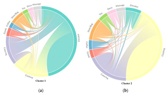A chord diagram is adopted to show the relationship of the semantic labels, and thus reveal the semantic pattern of one cluster, in Figure 15. The nine semantic types of semantic label are represented by nine fragments of the outer circle of the diagram, and arcs are drawn between them. The size of the arc is proportional to the number of semantic label pairs. We see that {catering, elevator} and {clothing, elevator} are strong semantic flows for cluster 1, while {catering, clothing} and {clothing, clothing} are strong semantic flows for cluster 2. Cluster 3 is similar to cluster 1, but the flows of {catering, catering}, {catering, massage}, and {catering, shoe/bag} are stronger than those of cluster 1. Interestingly, {catering, catering} is a relatively strong flow for cluster 3. A possible reason for this is that wandering customers do not have an appointed restaurant beforehand. When they encounter a restaurant, they spend some time browsing the menu and if they do not like the menu, they move on to the next restaurant.