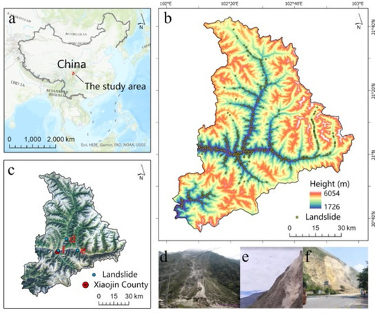 (a) The location of the study area. (b) Remote sensing images of the study area and the location of the three landslide cases. (c) Landslide inventory map and elevation map of Xiaojin County. (d–f) The landslide cases in the study area, d, e, and f are flow, fall, and slide respectively.