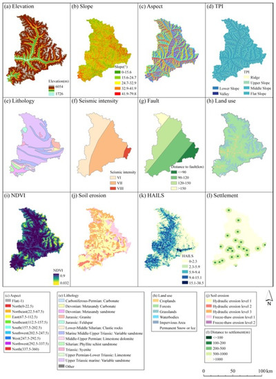 Thematic maps of conditional factors. (a) Elevation, (b) slope, (c) aspect, (d) TPI, (e) lithology, (f) seismic density, (g) fault, distance from mapping unit to the Longmen Shan Fault. (h) land use, (i) NDVI, (j) soil erosion, (k) HAILS, (l) settlement, distance from mapping unit to the nearest settlement.