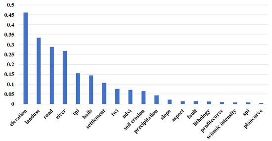 The elevation is the most important factor (with q of 0.46), which is followed by land use (0.33), road (0.29), and river (0.27). And the q of plan curve, seismic density, SPI, and profile curve are all less than 0.01, they are considered redundant factors [44]. Besides, the p-values for both TWI and profile curve are greater than 0.05, and thus the results are not statistically significant. As a result, the plan curve, seismic density, SPI, profile curve, and TWI should be eliminated. However, the result of the Interaction-detector provides additional information and insights beyond the above results. We can clearly see that seismic intensity plays a positive role in the interaction with other factors, as evidenced by the nonlinear enhancement of the cross-effects with each of the factors, while other factors do not have such a strong effect. So, we tried to keep the seismic intensity and remove the other four factors.