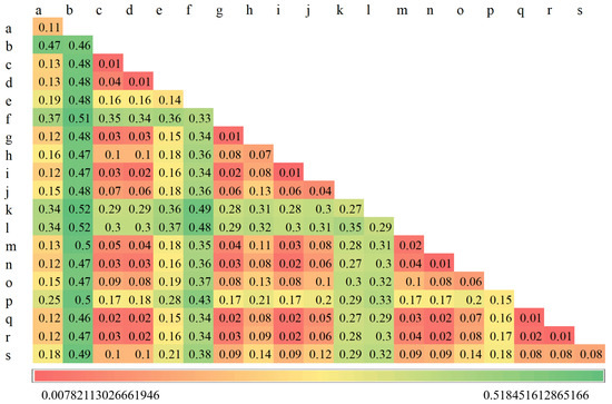 The interaction indices were calculated by Interaction detector (big value means strong interaction). Where a, b, …, s are settlement, elevation, aspect, fault, hails, land use, lithology, seismic density, fault, NDVI, plan curve, precipitation, river, road, slope, profile curve, soil erosion, TPI, SPI.