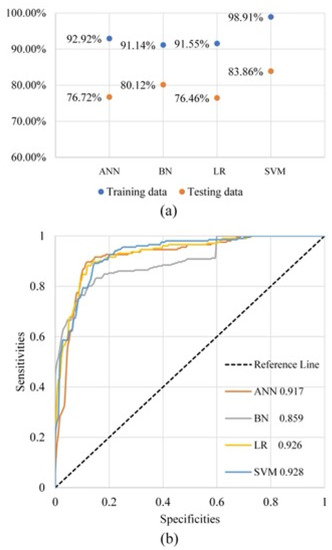(a) The prediction accuracy of machine learning cluster with training data and testing data. (b) The receiver operator characteristics (ROC) curve of the machine learning cluster, AUC is the acronym of the area under the ROC curve.