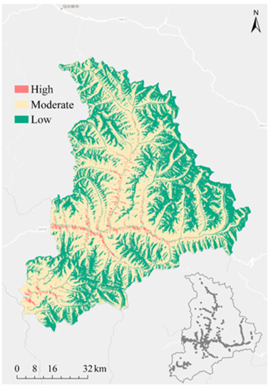 The LSM was prepared by generating landslide susceptibility indices (LSIs) and reclassifying the class. The LSI was calculated based on the trained machine learning cluster. Using the natural breaks method, the LSM was reclassified into three susceptibility classes: high, moderate, and low (Figure 8). The reason for classifying the susceptibility into five or more classes is that if they were divided into five or more classes, the high susceptibility areas would occupy only a very small share and thus be difficult to show on the map. As shown in Figure 8, high, moderate, and low susceptibility areas have distinct zoning characteristics. The proportion of areas occupied by high, moderate, and low areas is 6.03%, 37.52%, and 56.45%, respectively, while the proportion of landslides they correspond to is 60.87%, 31.98%, and 7.14%, respectively. The high susceptibility areas were concentrated in urban areas and in areas where previous disasters had occurred, which were also concentrated near roads and rivers.
