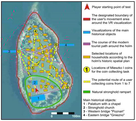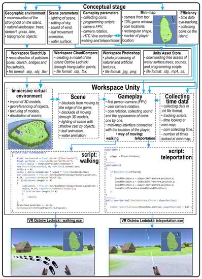 It is worth mentioning that in the research, we used a virtual presentation of the stronghold on the holm of Ostrów Lednicki (Poland) worked out in four workspaces: SketchUp, CloudCompare, Photoshop and Unity. Hence, we would like to focus specifically on cartographic design (mini-maps), GIS design (scene and gameplay for walking and teleportation) and IT design (scripts allowing one to obtain time data during the eye-tracking study) [].